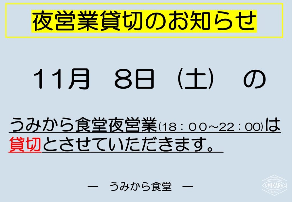 11月8日うみから食堂 夜営業貸切のお知らせ